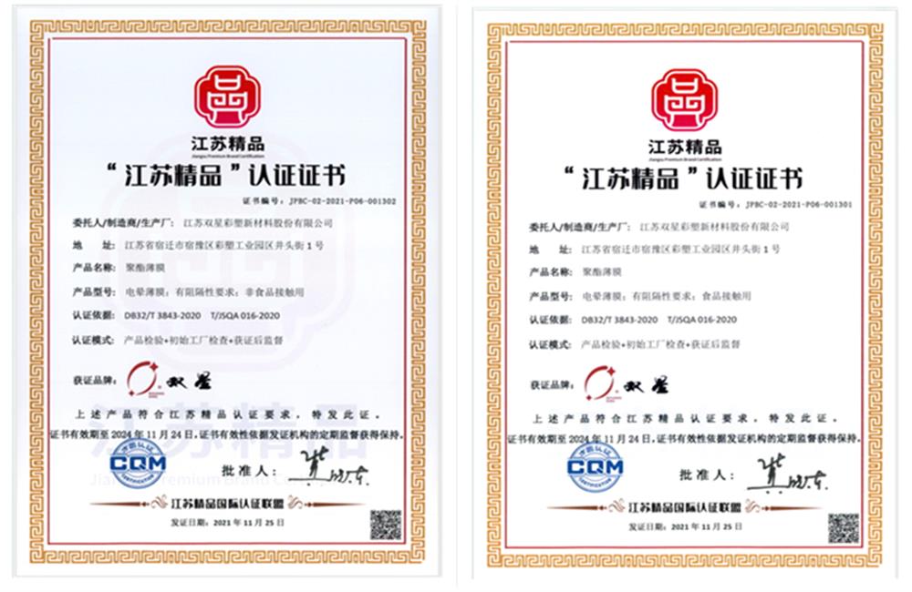Recently, the company received the certificate of "Jiangsu Boutique" issued by the "Jiangsu Boutique" International Certification Alliance, and two corona polyester film products of Double Star New Material were officially recognized as "Jiangsu Boutique", which marks that Double Star New Material has taken the lead in becoming one of the high-quality manufacturing brands of "Jiangsu Boutique".