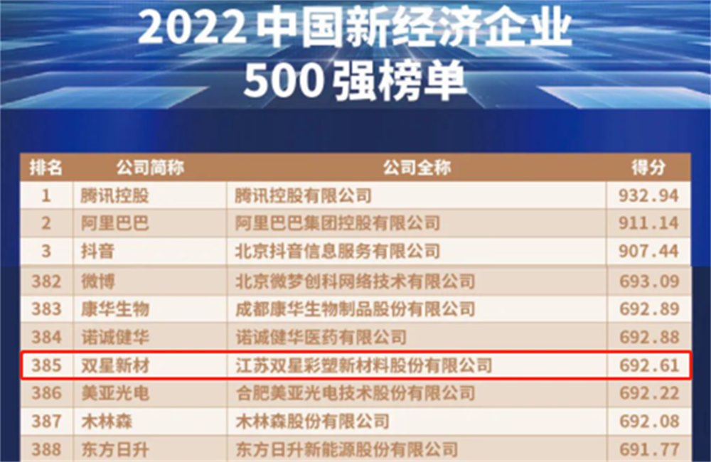 On March 30th, the 2022 China Top 500 New Economy Enterprises Conference was grandly held in Beijing. At the conference, the China Enterprise Evaluation Association officially released the "2022 China Top 500 New Economy Enterprises" list. Jiangsu Shuangxing Colored Plastic New Materials Co., Ltd. ranked 385th on the list with a score of 692.61 points due to its comprehensive innovation strength. This is the second consecutive year that Double Star New Materials has entered the list.