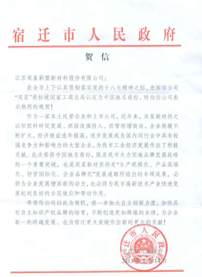 宿遷市人民政府發(fā)來賀信
