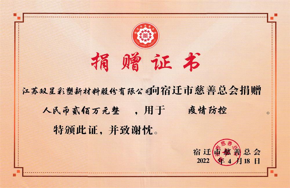 近期,宿遷中心城區轉入常態化疫情防控階段,在“管住”的基礎上實現“放開”,迅速恢復經濟運行正常秩序,宿遷經濟技術開發區等四個功能區是復工復產的主戰場。雙星新材高度重視,積極響應政府號召, 4月18日雙星新材向宿遷市慈善總會捐款200萬元,專項用于“四個功能區”常態化疫情防控和中心城區重點醫院購買防疫物資。鞏固抗疫成果,助力復工復產,全力支援抗擊疫情工作,為打贏這場戰爭貢獻一份力量。相信在雙星新材和所有愛心人士的幫助下,全民一心、眾志成城,疫情定能夠早日成為過去。