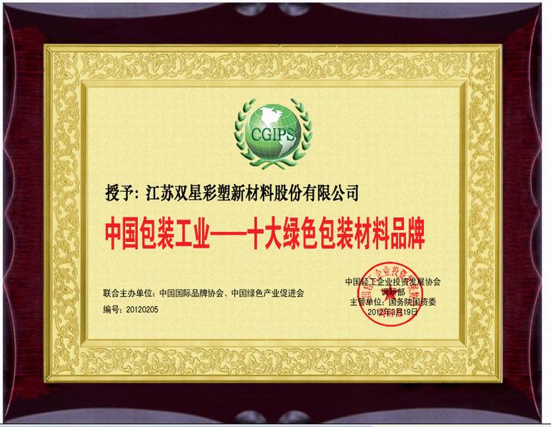 近日,公司被“中國輕工業投資發展協會”授予“中國包裝工業——十大綠色包裝材料品牌”。