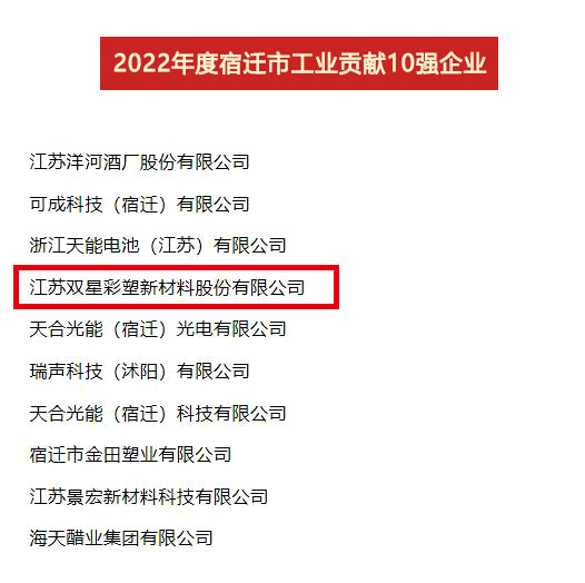 2023年4月7日,全市開發區高質量發展暨工業經濟年度表彰大會召開,公布了2022年度“宿遷市工業貢獻10強、工業投資10強、工業銷售10強”名單,雙星新材喜獲“貢獻10強位列第4位、投資10強位列第6位、銷售10強位列第8位”。
