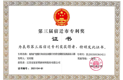 2021年5月7日,全市加快工業經濟高質量發展暨招商引資大會上,表彰了第三屆宿遷市專利獎獲獎單位,公司申報的“視角擴寬膜片和具有該膜片的背光模組及液晶顯示器”專利項目榮獲一等獎。