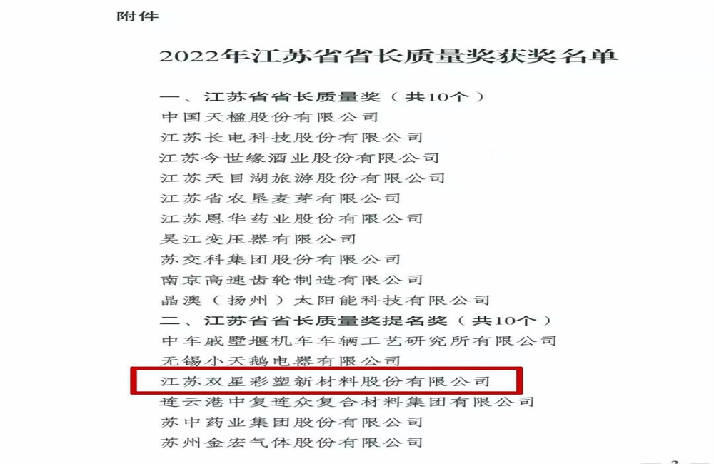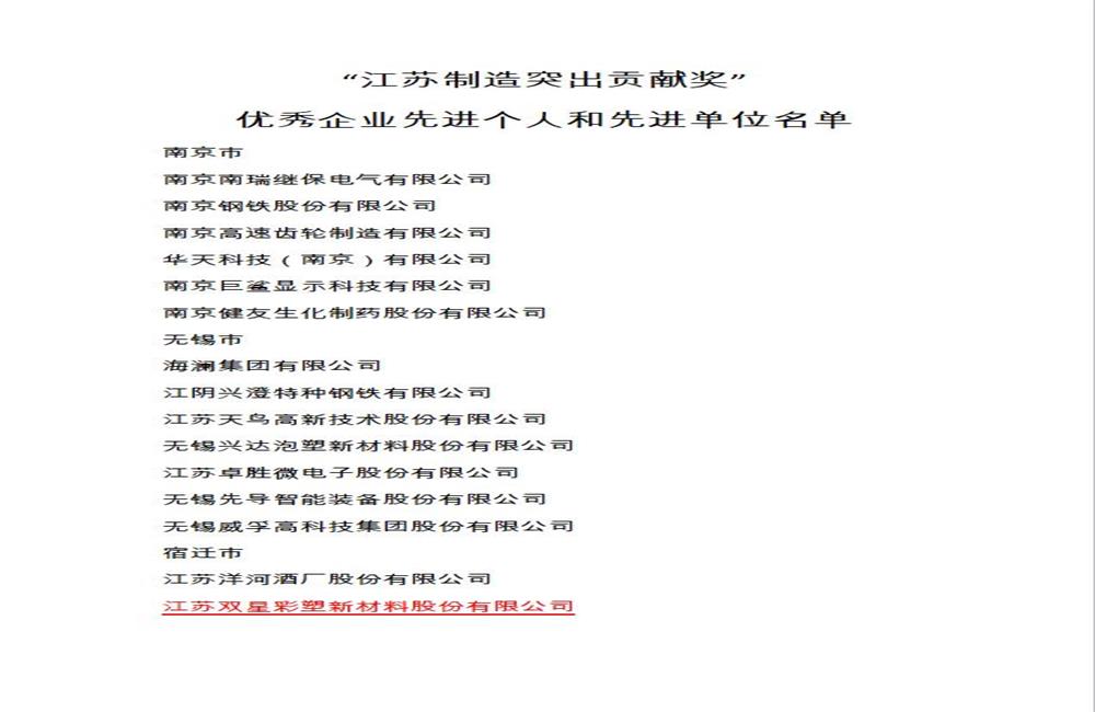 雙星新材入選“江蘇制造突出貢獻獎“優秀企業榜單